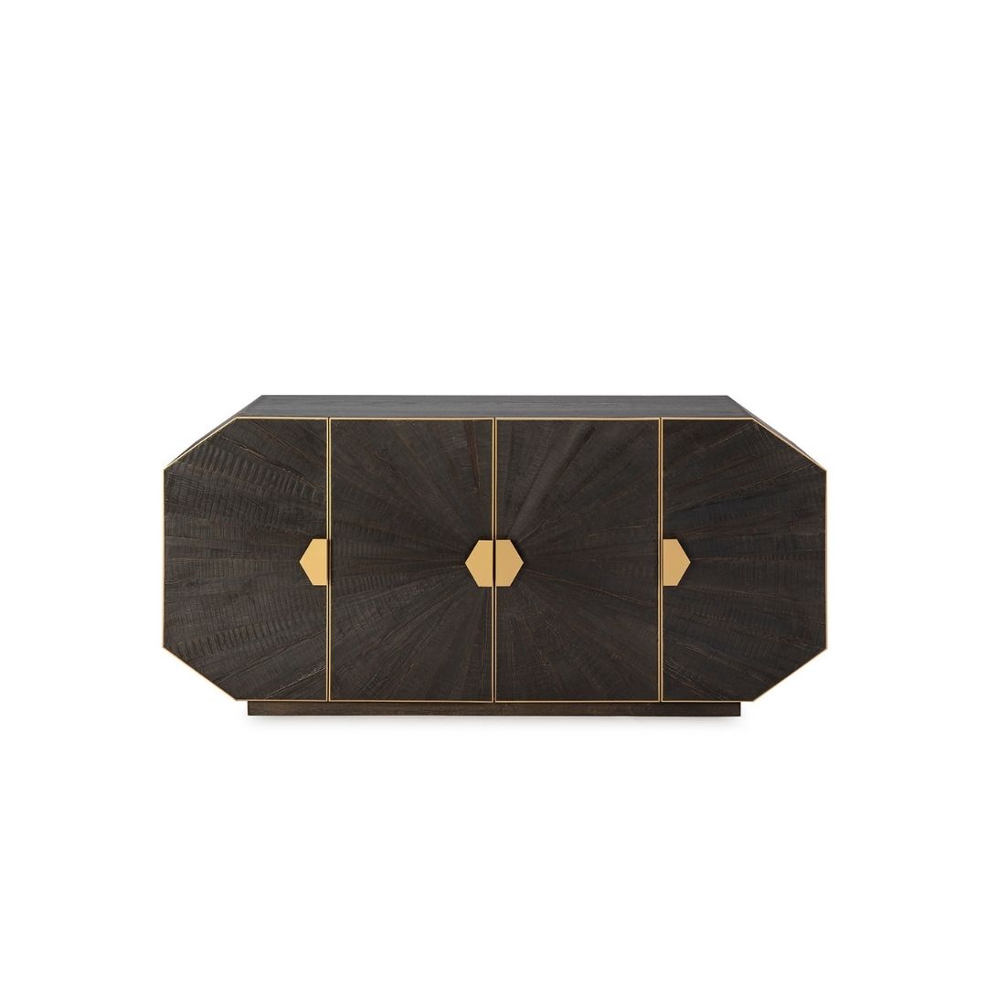 Μπουφές σαλονιού κατασκευασμένος από σκούρο καφέ ξύλο με μεταλλικέ χρυσές λεπτομέρειες