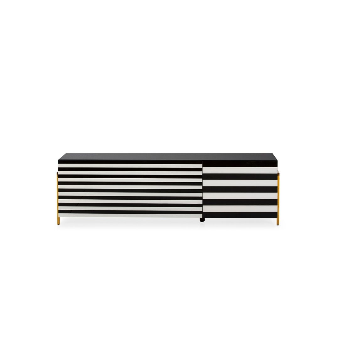 Ασπρόμαυρο έπιπλο τηλεόρασης με ριγέ μοτίβα και περίτεχνη σιδερένια βάση