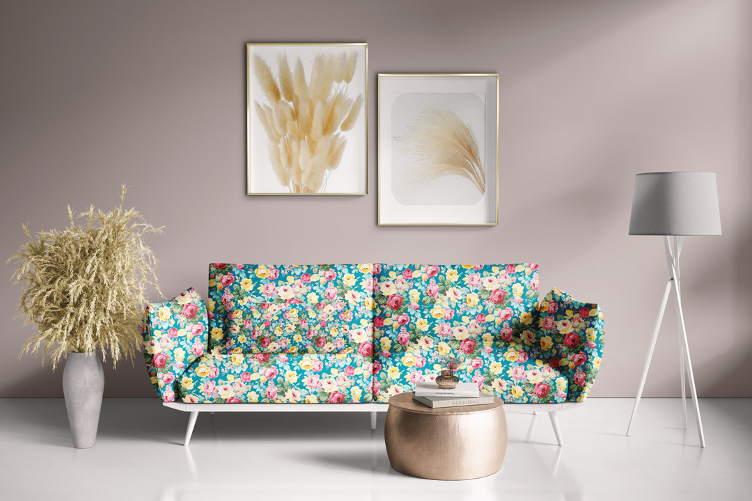 Ύφασμα επίπλωσης βαμβακερό, εμπριμέ σε κόκκινο, κίτρινο και μπλε, στυλ country.