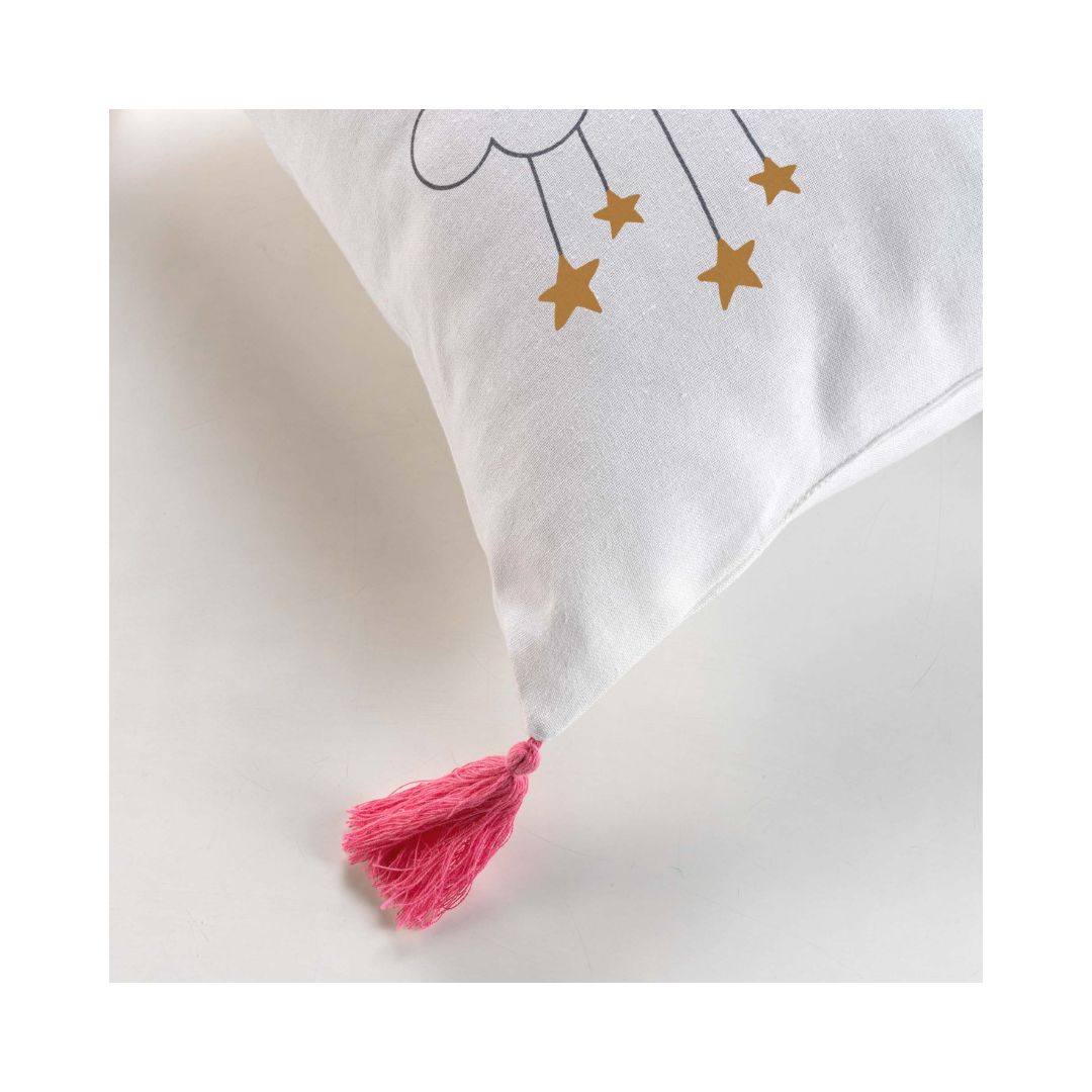 Διακοσμητικό μαξιλάρι σε λευκό χρώμα, με παιδικό θέμα ουράνιο τόξο και κρόσσια στις άκρες του σε ροζ χρώμα. Μήκος 40 εκ. x Πλάτος 40 εκ.