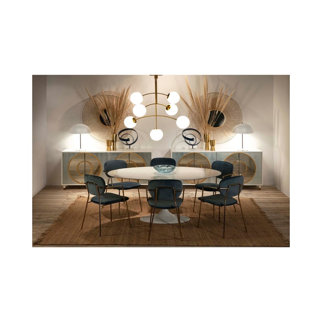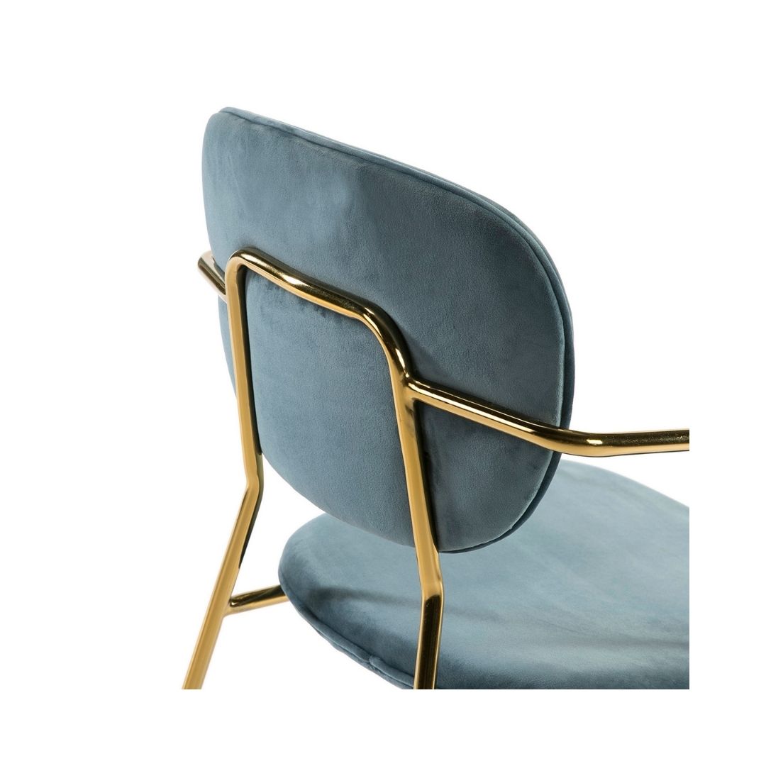 Καρέκλα τραπεζαρίας, επενδεδυμένη με βελούδινο ύφασμα μπλε χρώματος. Διαθέτει ιδιαίτερο μεταλλικό, λεπτό σκελετό χρυσής απόχρωσης, καθώς και μεταλλικά μπράτσα. Προσφέρει στο χώρο ταυτόχρονα πολυτέλεια και μοντέρνα αισθητική. Ιδανική επιλογή για art deco και μοντέρνα στυλ διακόσμησης. Διαστάσεις: Μήκος: 55 Βάθος: 55 Ύψος: 82 Βάρος: 7 κιλά