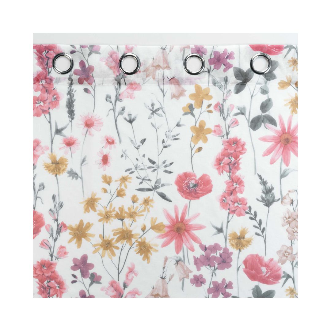 Κουρτίνα με υφή γάζας και τύπωμα λουλουδιών σε λευκό και ροζ χρώμα. Προσφέρει αέρινο σουπλάρισμα. Μια επιλογή κατάλληλη για σαλόνι, κρεβατοκάμαρα και κουζίνα. Ταιριάζει με country διακοσμητικό στυλ.