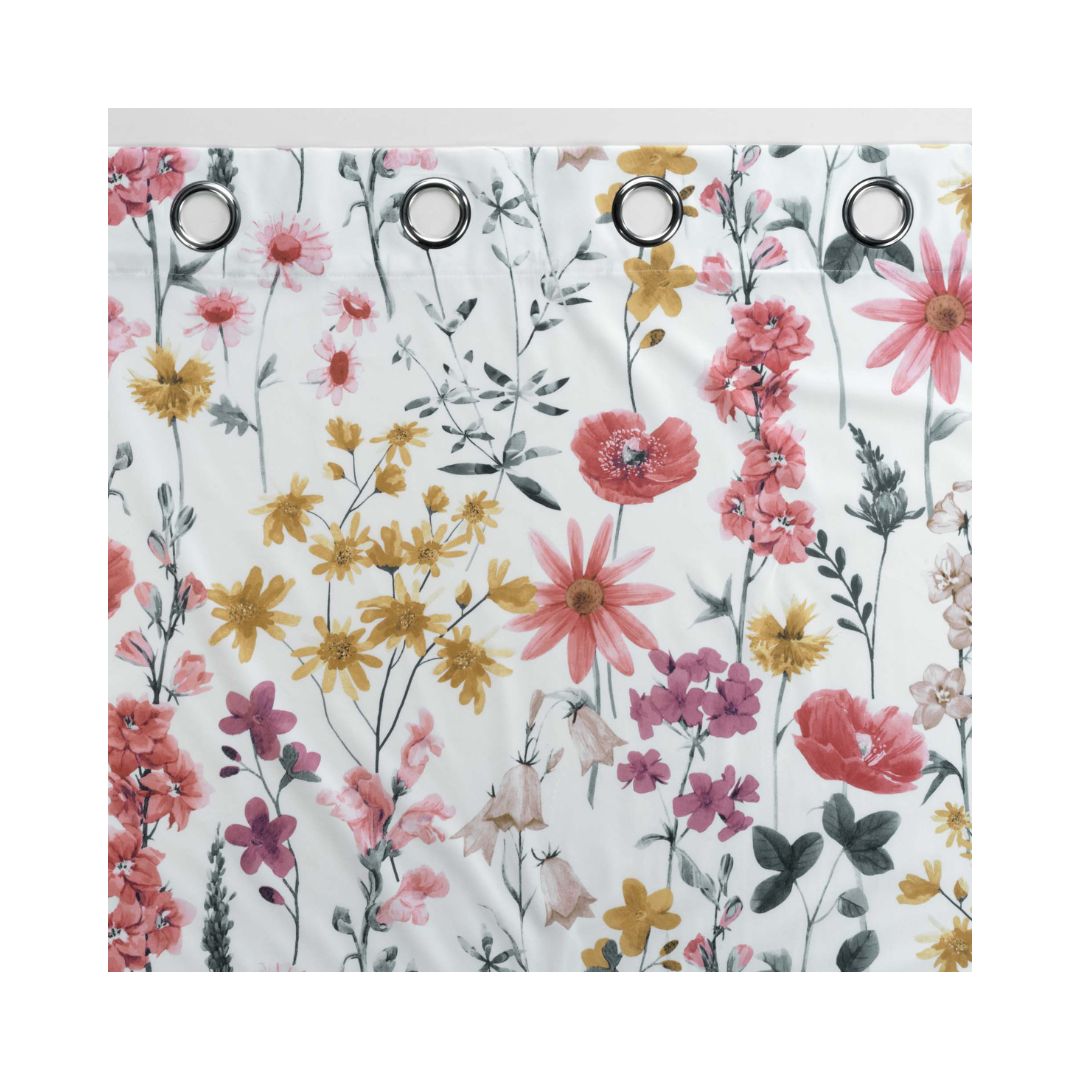 Κουρτίνα με υφή βελούδου και τύπωμα λουλουδιών σε λευκό και ροζ χρώμα. Προσφέρει σταθερό σουπλάρισμα. Μια επιλογή κατάλληλη για σαλόνι, κρεβατοκάμαρα και κουζίνα. Ταιριάζει με country διακοσμητικό στυλ.