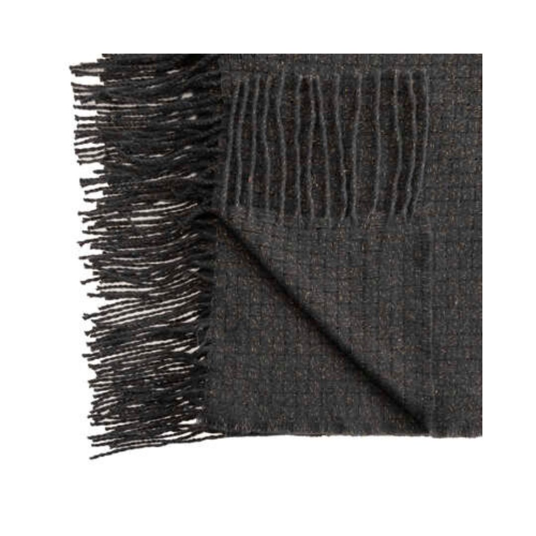 Ριχτάρι σε σκούρο γκρι χρώμα με χρυσή κλωστή, με κρόσσια. Μια διαχρονική επιλογή για καναπέ, πολυθρόνα και κρεβάτι. Ταιριάζει αρμονικά με μοντέρνο και σκανδιναβικό διακοσμητικό στυλ. Μήκος 130 εκ. x Πλάτος 180 εκ.