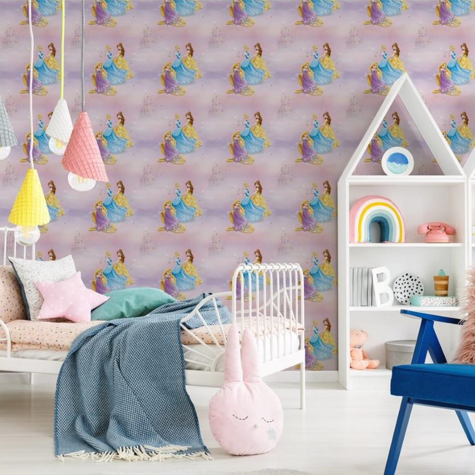 Ταπετσαρία τοίχου παιδική σε υπέροχες ροζ και μοβ αποχρώσεις, με τρεις απο τις αγαπημένες πριγκίπισσες των παραμυθιών της Disney
