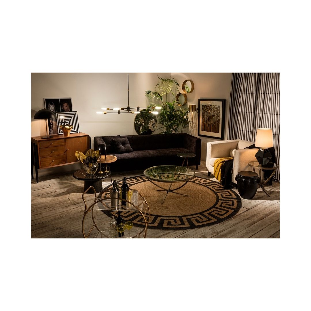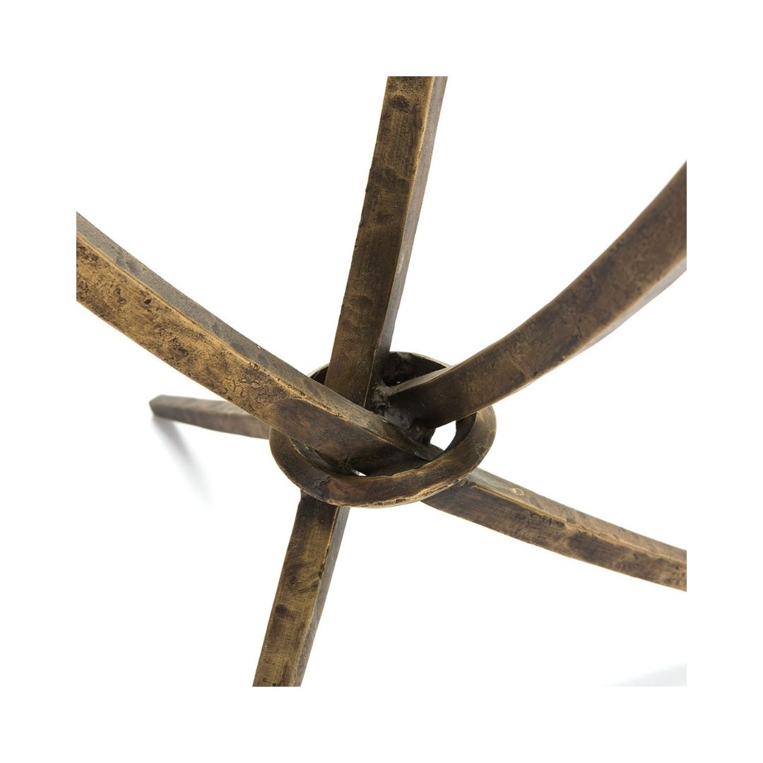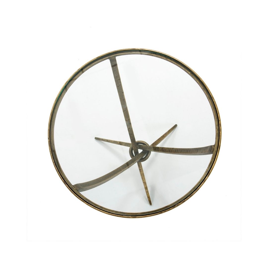Βοηθητικό τραπεζάκι, στρογγυλού σχήματος, με γυάλινη επιφάνεια και μεταλλικές περίτεχνες βάσεις μπρονζέ χρώματος. Αποτελεί επιλογή νεοκλασικού στυλ διακόσμησης. Διαστάσεις: Μήκος: 51 Βάθος: 51 Ύψος: 56 Βάρος: 15 κιλά