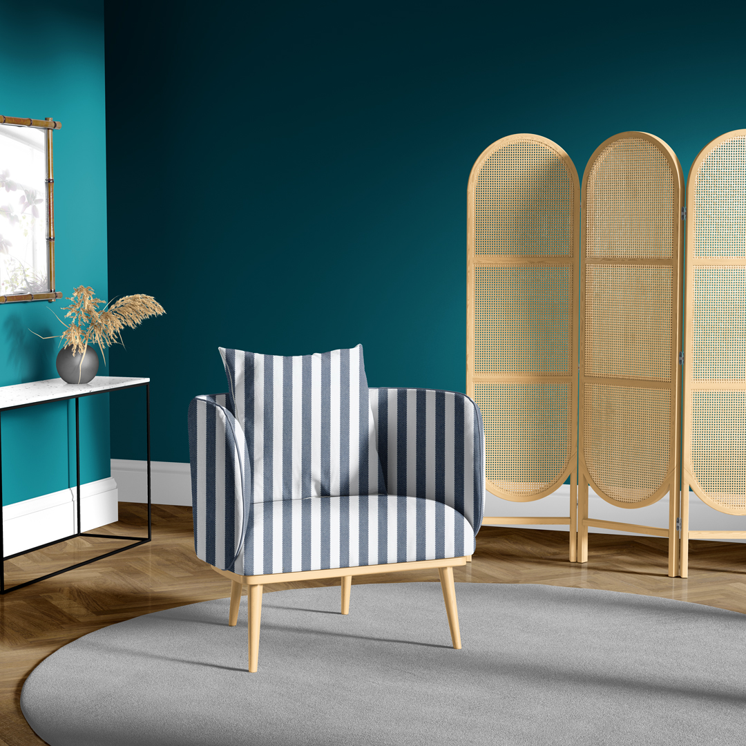 Υφασμα επίπλωσης καραβόπανο, με λεπτές ρίγες στην ύφανσή του, σε χρώματα του μπλε λευκού. Κατάλληλο για εξωτερικό χώρο με υψηλή αντοχή στην τριβή, 20.000 βαθμών Martindale. Διαθέτει ανθεκτικότητα στο ηλιακό φως, στην υγρασία, στην μούχλα και στο λάδι. Ταιριάζει σε μοντέρνο και ethnic διακοσμητικό στυλ.