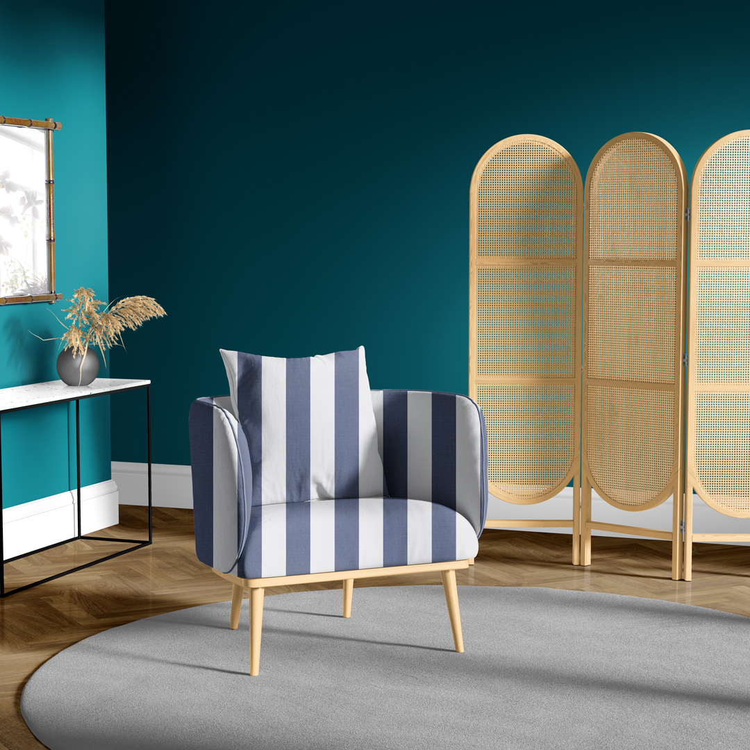 Υφασμα επίπλωσης καραβόπανο, με ρίγες στην ύφανσή του, σε απόχρωσεις του μπλε λευκού. Κατάλληλο για εξωτερικό χώρο με υψηλή αντοχή στην τριβή, 20.000 βαθμών Martindale. Διαθέτει ανθεκτικότητα στο ηλιακό φως, στην υγρασία, στην μούχλα και στο λάδι. Ταιριάζει σε μοντέρνο και ethnic διακοσμητικό στυλ.