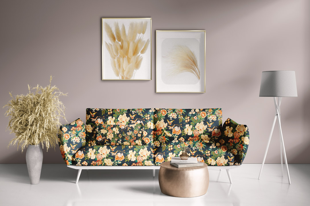 Ύφασμα επίπλωσης, υψηλής ποιότητας βαμβακερό βελουτέ, ιδιαίτερα απαλό στην αφή. Έχει ζωηρά φλοράλ σχέδια σε πράσινους και πορτοκαλί τόνους σε μαύρο φόντο. Με ανθεκτικότητα 50.000 βαθμών Martindale, ιδανικό για σαλόνι και κρεβατοκάμαρα. Για διακοσμητικό στυλ country.