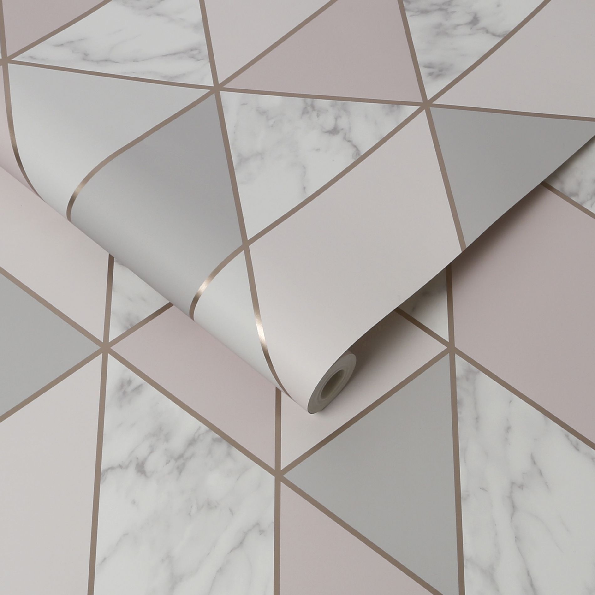 Ταπετσαρία τοίχου με απαλή υφή και επαναλαμβανόμενα γεωμετρικά μοτίβα, με χρώματα γκρί-ασημί, ροζ παλ, λευκό και μάρμαρο στο εσωτερικό των σχεδίων