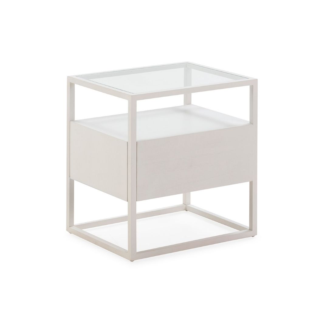 • × Ξύλινο κομοδίνο με γυάλινη επιφάνεια σε λευκό χρώμα