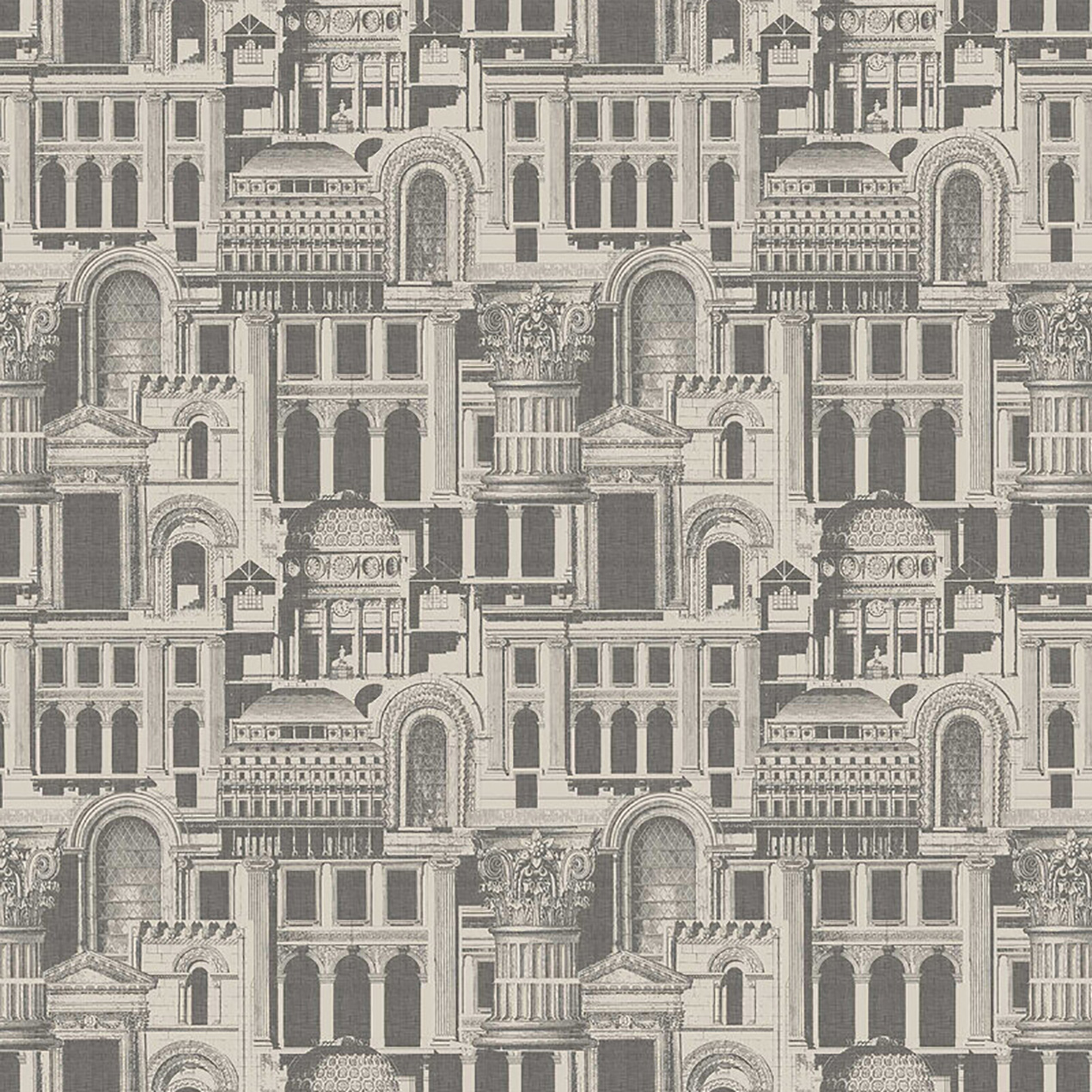 Ταπετσαρία τοίχου με περίτεχνα αρχιτεκτονικά δομήματα σε γκρι και μπεζ αποχρώσεις. Ιδανική για ρετρό και νεοκλασικό στυλ διακόσμησης.