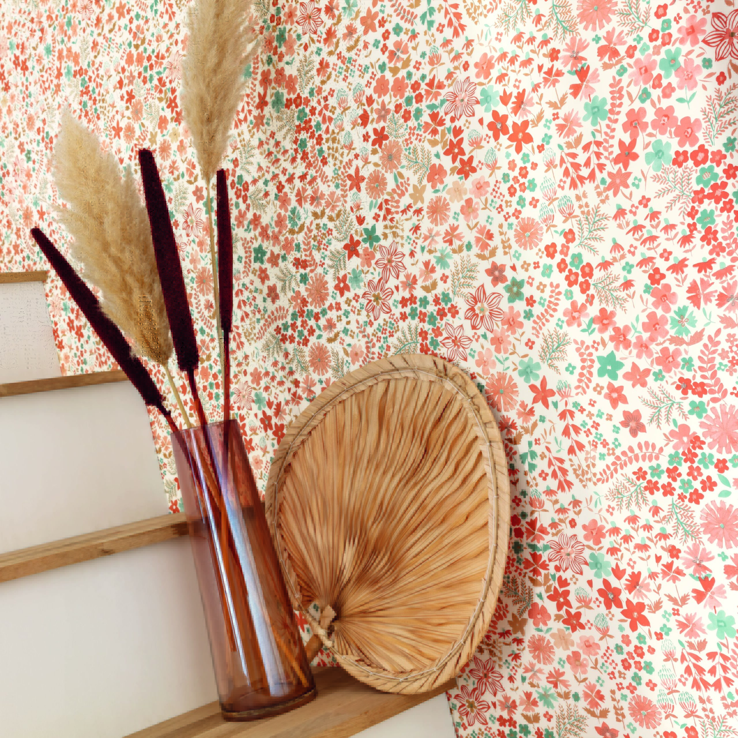Ταπετσαρία τοίχου με πολύχρωμα φλοράλ σχέδια μικρής κλίμακας σε σομόν και βεραμάν αποχρώσεις. Ταιριάζει σε bohemian, country και σκανδιναβικό στυλ διακόσμησης
