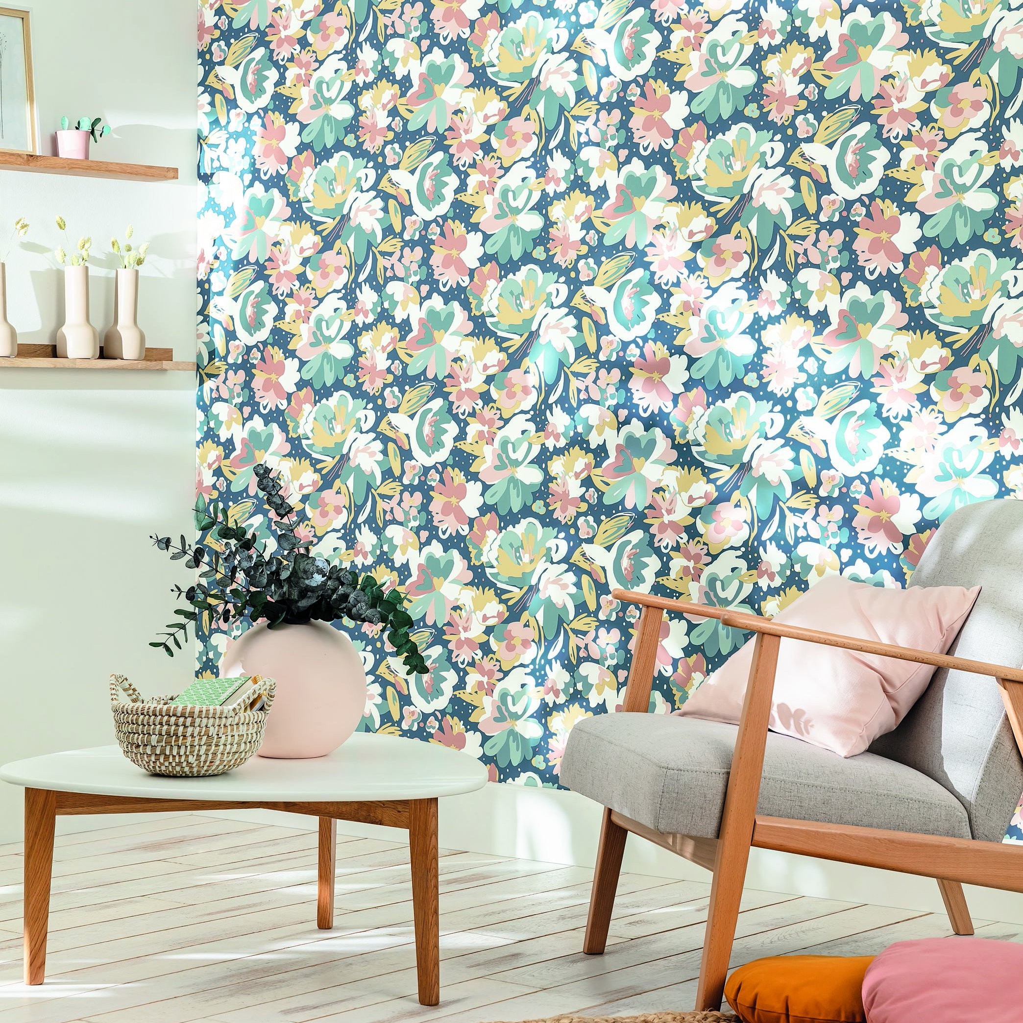 Ταπετσαρία τοίχου με χαρούμενα φλοράλ μοτίβα σε μπλέ, γαλάζιους και σομόν τόνους. Ταιριάζει σε bohemian, country και σκανδιναβικό στυλ διακόσμησης